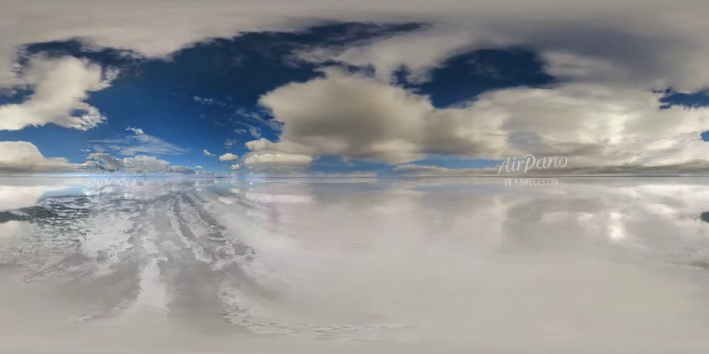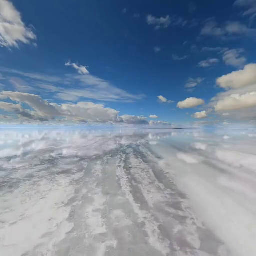 Prompt: A view of the vast salt flats, the serene sky with scattered clouds, and the mirror-like reflection on the salt flat's surface.
