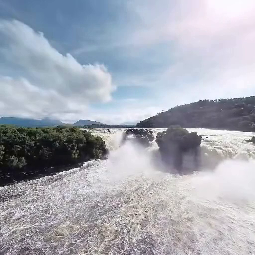 Prompt: A view of the turbulent river, the cascading waterfalls, the lush green hills, and the vast sky with scattered clouds.